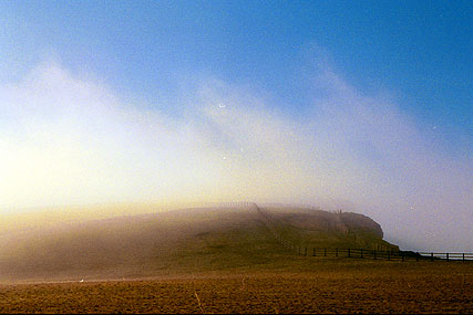 This is just next to the Cliffs of Moher. James and I had been driving all day through the Burren, and finally broke from the fog to the area of the cliffs. We were amazed and ecstatic to have escaped the fog, but in the time it took us to walk across the parking lot the fog found us. This is a shot of the fog bank rolling in, already starting to obscure the cliffs. By the time we walked up the trail to the edge of the cliffs, the ocean was lost to us.