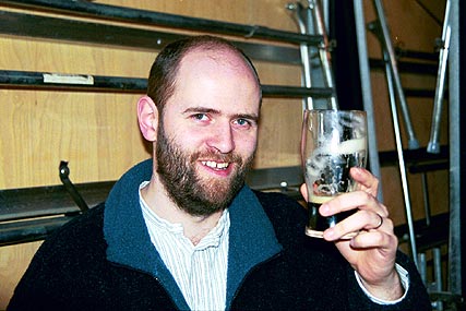 Back in time to the first weekend of my trip, when I attended WarpCon in Cork. This is my friend Myles Corcoran, hefting a Guinness I believe. Guinness is made in Dublin, while Murphy's is the drink of Cork. Myles and his wife Samantha hosted me for a night during my travels. I went to the wrong address, and the woman who answered the door bore a vague-enough resemblance to Sam that I thought it might be her. I said something about "Sorry I'm late," and she said, "Oh, that's all right," and I said "So may I come in?" and she said "Of course," and I walked in with my backpack, said hello to another woman in the kitchen, turned around to the first and said, "I'm in the wrong house," and she said, "Oh I see," and laughed and I went outside again. They're very friendly people, the Irish.