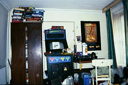From the past to the present. In Dublin I stayed one night at a hostel, but the rest of the time I was with a great bunch of guys who had an apartment there. It was a three-bedroom place as I recall, but there were something like six people living in it. Among the Irish gaming community, people seem to move between Cork and Dublin every couple years, whenever they get sick of one place or the other. This apartment was sort of the staging ground for Irish gamers from Cork who were moving to Dublin and looking for a place to live, so there were always a few extra people around who hadn't found a flat yet. They gave me a mattress on the floor of the living room, where someone else was already sleeping. We had a great time. Lots of drinking, games, and wrestling shows. This picture sort of sums up the flat: tons of boxed games in and on a closet, an original Gauntlet video game that sort of worked, a Star Wars poster, and a dual-turntable DJ set-up on the table because the guys were mad for club music and one of them was a professional DJ. Dotc, Morgan, and Brian were sort of my main hosts in Dublin; I can't keep the names of the others there straight I fear. Morgan's web page has photos of the crew and many of the other people I met at WarpCon.